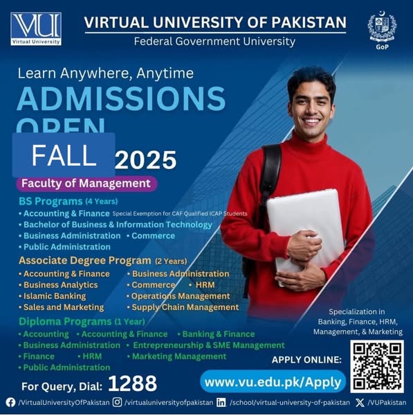 搜索关键词 Virtual University Pakistan, Online Education, Fall 2025 Admissions, Higher Education Programs, Flexible Learning, Online Courses, Degree Programs, Pakistan University, Shadbagh Campus Lahore, Internship Opportunities优势 Flexible learning options,Cutting-edge online resources,Experienced faculty,Wide range of programs,Regular & Online Classes,Internship Opportunities,Final Project Guidance