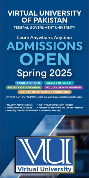搜索关键词 Virtual University Pakistan, Spring 2025 Admissions, Online Degree Programs, Federal Government University, Higher Education Pakistan, Jaranwala Campus, ADP BS Programs, Apply Online Now, Affordable Education, Flexible Learning优势 Wide range of degree programs,Regular and Online classes,Best facilities and professional staff,Convenient Online Application