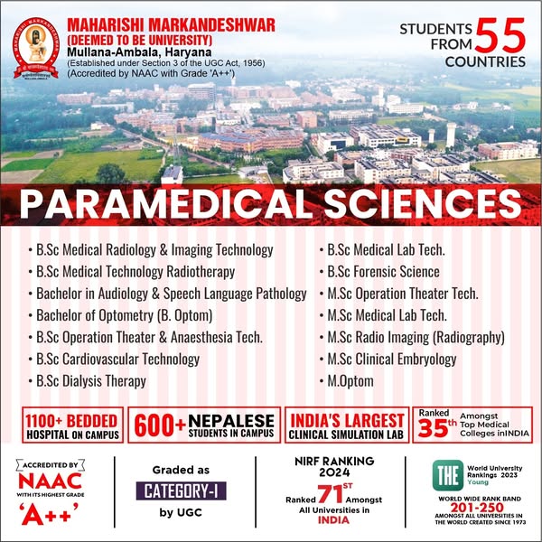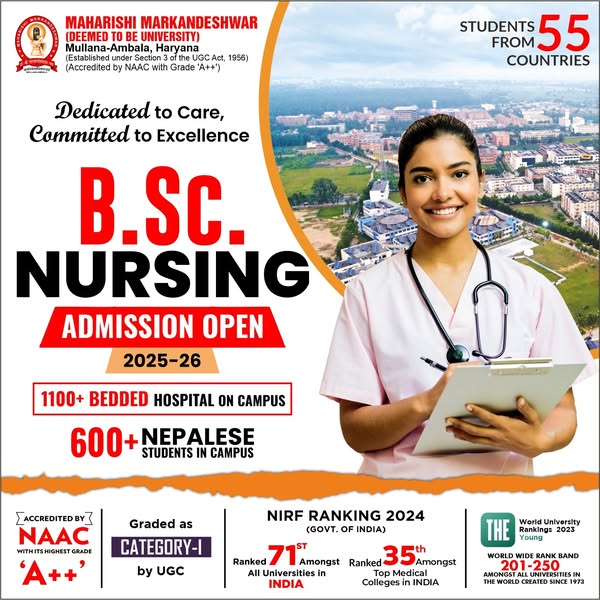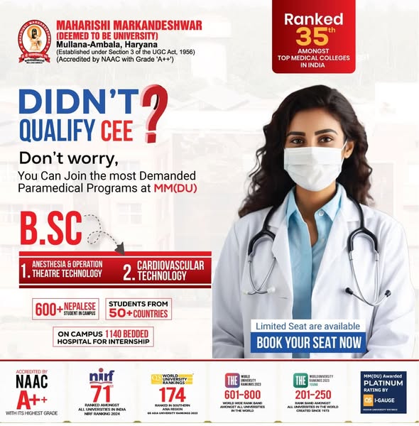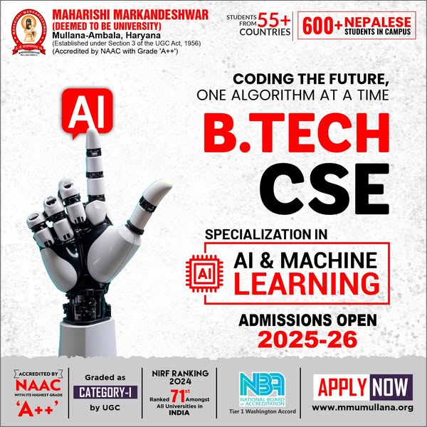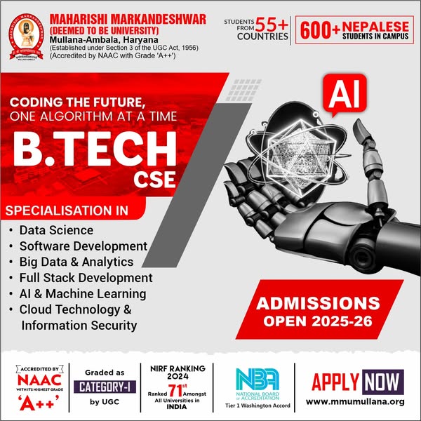 Ready to launch your dream career? 🚀 Join MM(DU) where innovation meets excellence! With cutting-edge technology, expert faculty, and a future-focused curriculum, we shape the leaders of tomorrow. ✅ NAAC A++ Accredited. ✅ Ranked 71st in NIRF (Govt. of India Rankings) amongst All Universities in India ✅ 600+ Nepalese students thriving at MM(DU) ✅ A global community of students from 55+ Countries. ✅ Accredited by NBA ( Tier 1) Washington Accord. ✅ Times World University Rankings by Subject 2025 -- 801-1000 Ranked Amongst Top Engineering Colleges of the World. ✅ Times World University Rankings by Subject 2025 -- 601-800 Ranked Amongst Top Medical & Health Colleges of the World. Why wait? Your journey to success starts here!