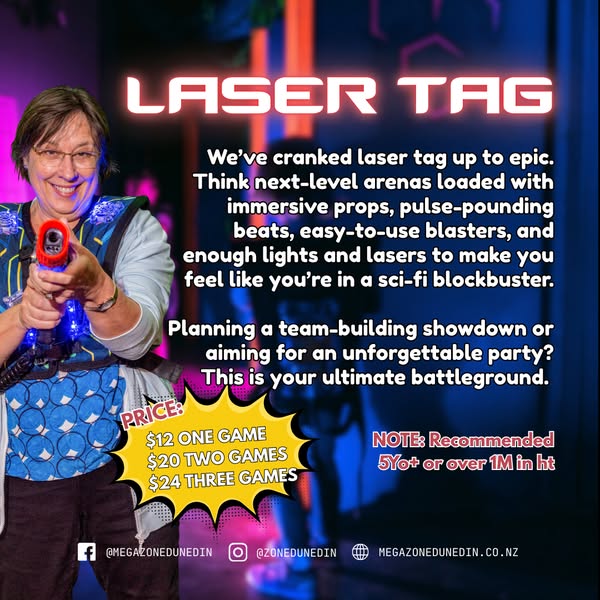 搜索关键词 laser tag Dunedin, fun activities Dunedin, megazone experience, book entertainment, group activities, family fun优势 Fun and engaging activity,Easy booking process,Suitable for groups