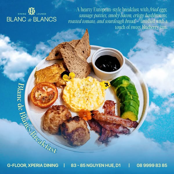 Blanc de Blancs Breakfast – Đậm chất Âu với trứng chiên, xúc xích thủ công, thịt xông khói, khoai hashbrown giòn rụm, cà chua nướng và bánh sourdough – chốt hạ bằng một chút mứt việt quất ngọt ngào.