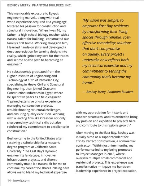 The Contractor report from Alameda County newspapers, The formal Alameda County magazine has published Phantom Builders Achievements on the first Page.