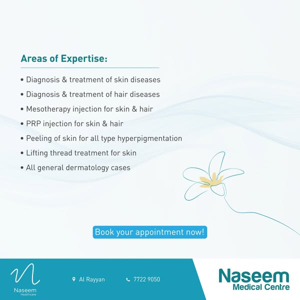 Get expert care for all your skin and hair needs with Dr. Ali Ahmed Sabri at Naseem Medical Centre, Al Rayyan. Book your appointment today for personalized dermatology solutions!