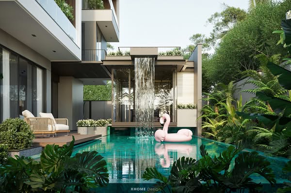 • Quy mô: 3 tầng, phòng ngủ master, phòng gym, hồ bơi, hầm rượu,...