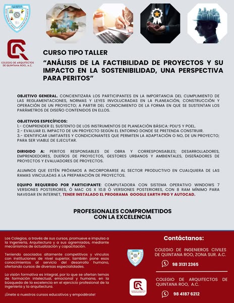 📢 El Colegio de Ingenieros Civiles de Quintana Roo Zona Sur A.C. en conjunto con el Colegio de Arquitectos de Quintana Roo A.C. los invita a unirse al Curso Tipo Taller "Análisis de la Factibilidad de Proyectos y su impacto en la sostenibilidad, una Perspectiva para Peritos". Presentado por la Ing. María Antonia Hernández Rivas. 📢