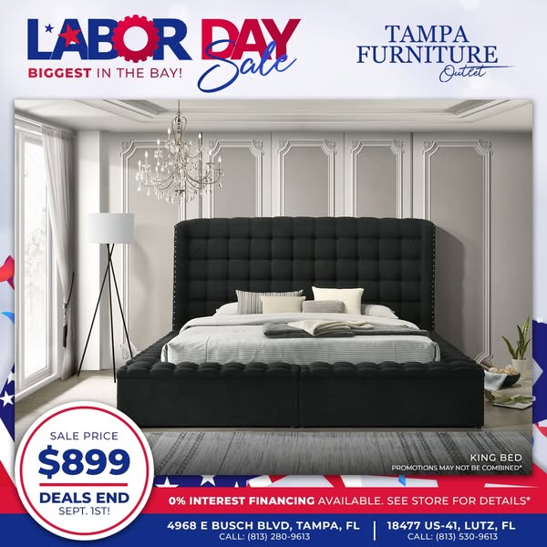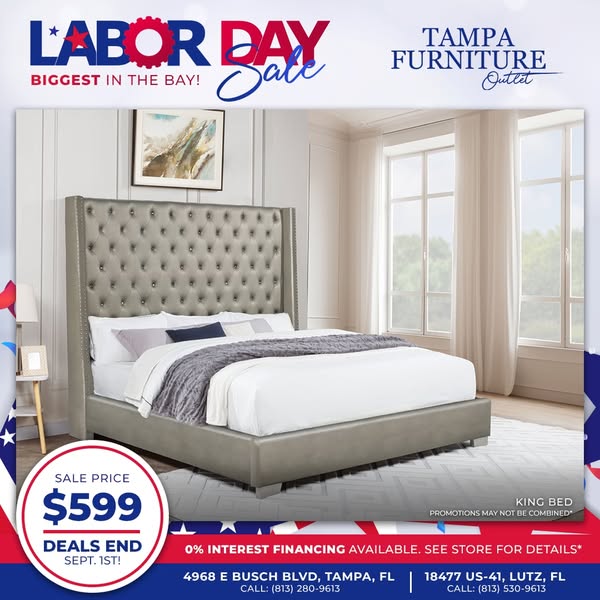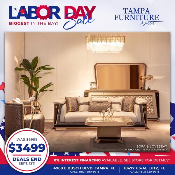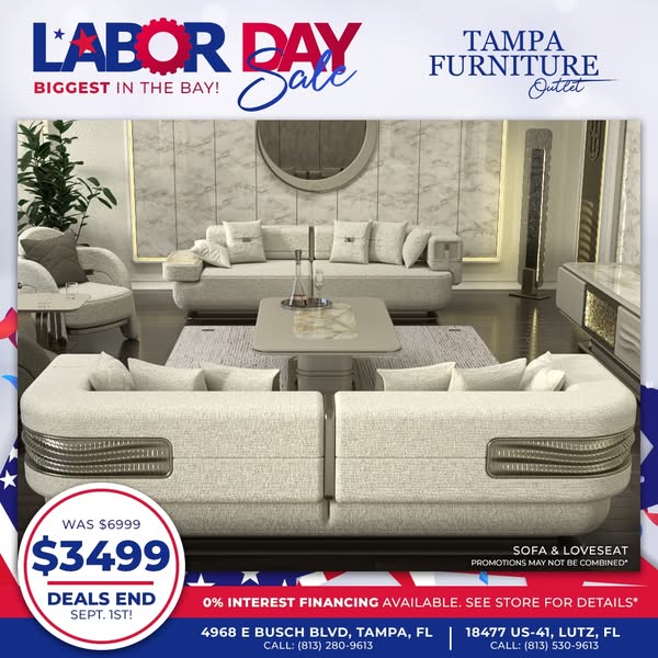 搜索关键词 Labor Day furniture, Furniture outlet Tampa, Tampa furniture deals, Furniture sale, Discount furniture, Home furniture, Furniture store Tampa, Tampa Furniture Outlet, Furniture Lutz FL, Big furniture savings优势 Big Savings,Labor Day Deals,Multiple Locations