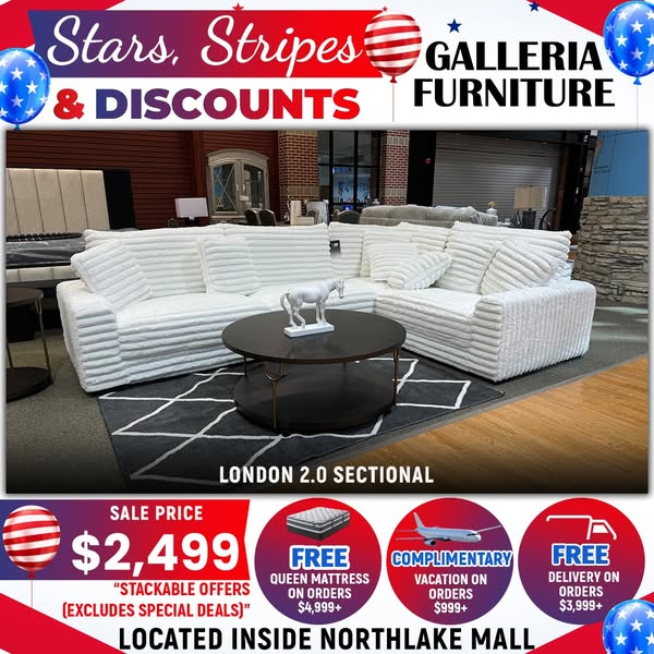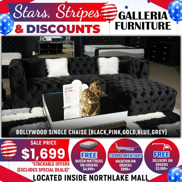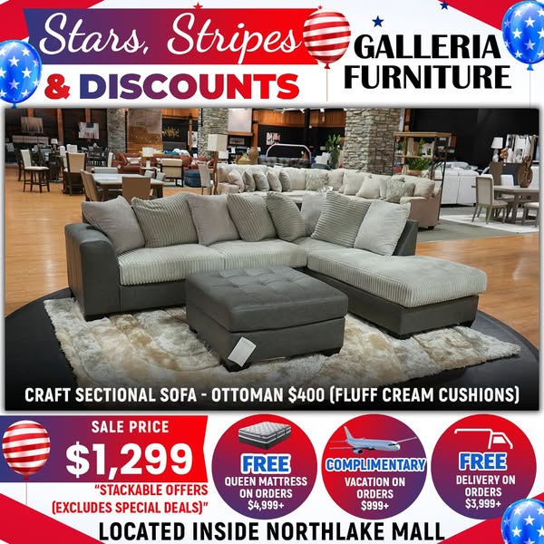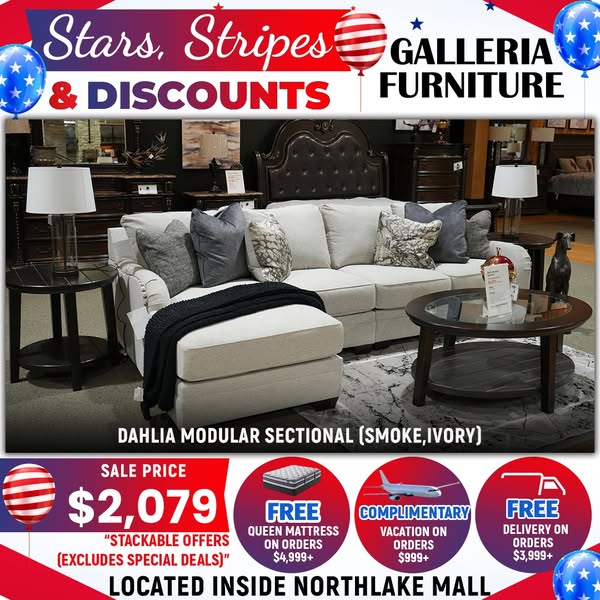 搜索关键词 living room furniture, furniture sale, free delivery, queen mattress, vacation offer, Galleria Furniture, Charlotte NC, furniture deals, furniture sets, home decor优势 Up to 30% OFF,Free Delivery on orders over $3,999+,Free Queen Mattress with purchases over $4,999,Complimentary Vacation with purchases over $999+