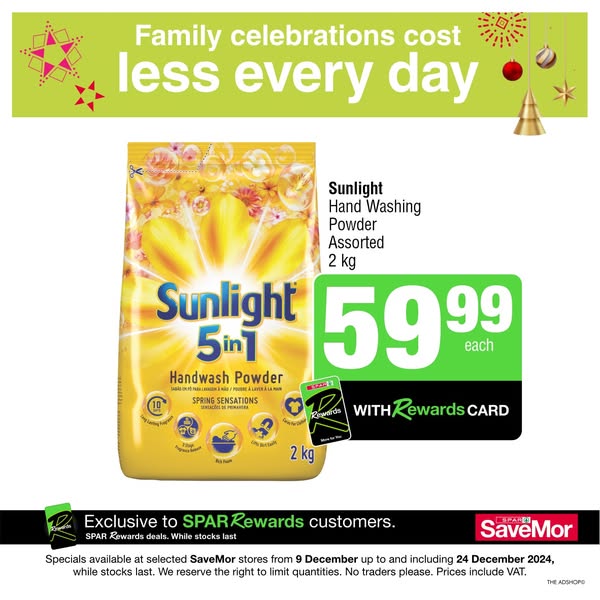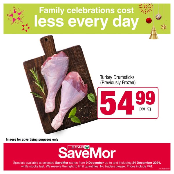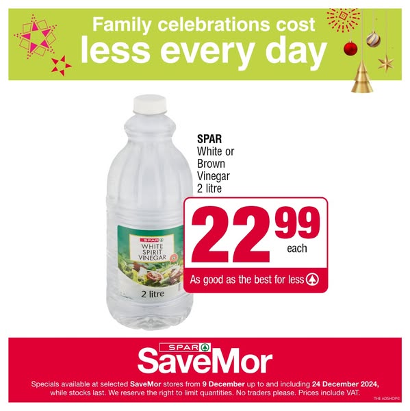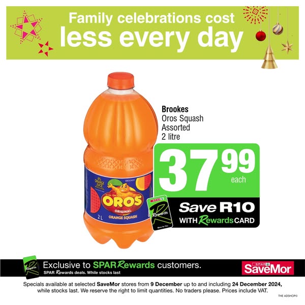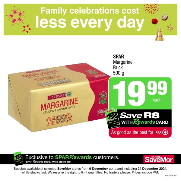 Dezemba is here! 🎉 Get ready for a festive season of savings at SPAR SaveMor Bronberg! 🙌 Enjoy amazing deals in-store and stand a chance to win your share of R200,000 in prizes! T's & C's apply. SaveMor, Today, EVERY DAY! 🛒 Prices are valid from 09 December up to and including 24 December 2024, while stocks last. Errors and omissions excepted (E&OE).