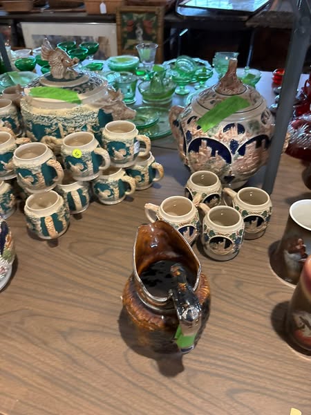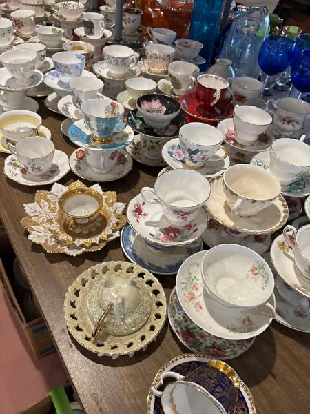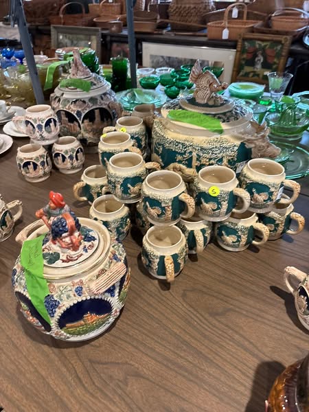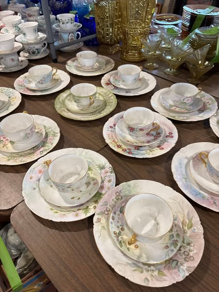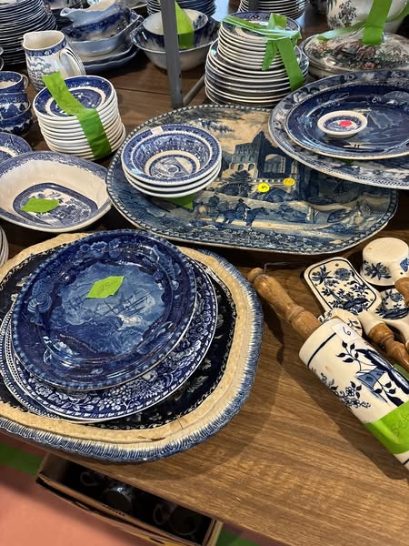 Pottery - modern dinnerware, porcelain, tea cups, figurines, dishes, antique dishes, Bavarian, Limoges, Flow blue, Blue Willow (1000’s of pieces), punch bowl sets, mustache cups, shaving mugs, tea sets and dinner sets.