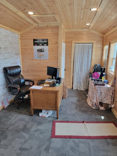 12x24 Portable Office Complete with Finished Walls & Ceiling, Can Lighting, Carpet, Thermal windows, 9-lite door, bathroom with sink & commode, electricity, insulation in the walls & ceiling.