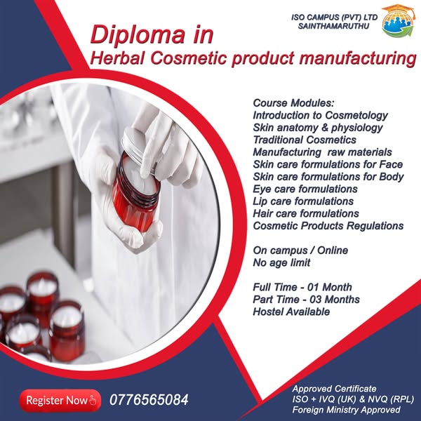 搜索关键词 vocational training, job training, skills development, self employment, income opportunity, practical skills, diploma certificate, ISO CAMPUS, Sainthamaruthu优势 High earning potential after training (150,000 - 300,000 LKR),Practical and theory-based learning with job training.,Experienced instructors.,Accommodation for out-of-town students.,Recognized diploma/certificate upon completion (ISO, UK(IVQ), NVQ).,No prior education, English knowledge, or age limit required.
