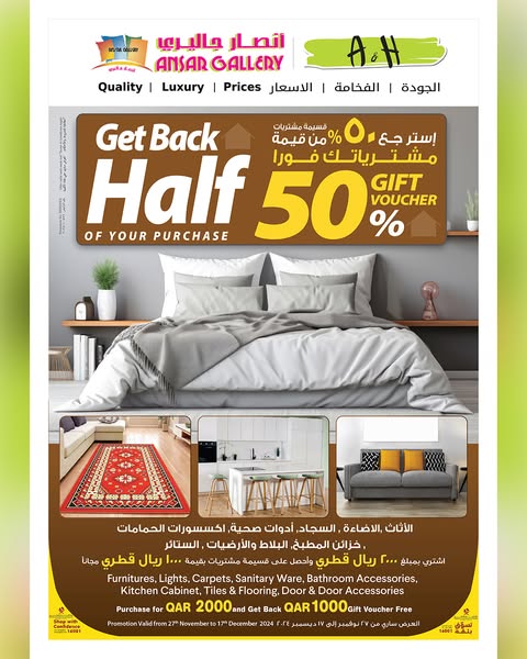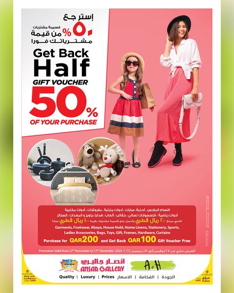 💥 لقد حان عرض استرجع نصف قيمة مشترياتك فورًا بقسيمة شرائية 💥 استعد لتجربة تسوق لا تقبل المنافسة! استمتع بالعروض الحصرية في أنصار جاليري من 27 نوفمبر إلى 17 ديسمبر. من الموضة إلى مستلزمات المنزل، كل ما تحتاجه معروض للبيع! 🛒🛍️ لمعرفة المزيد عن عروضنا الترويجية المذهلة، أرسل لنا "مرحبًا" على WhatsApp على الرقم 50026663. 📲 يمكنك أيضًا الطلب بسهولة من خلال موقعنا الإلكتروني