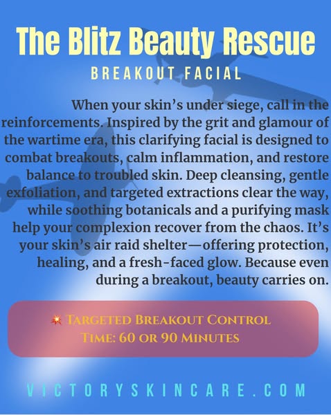搜索关键词 vintage skin care, 1940s glamour spa, victory skincare facials, blitz beauty rescue, silver screen lift, radiant skin treatments, spa makeover, timeless beauty, pin-up flair, book facial appointment优势 Glamorous 1940s theme,Timeless treatments,Expert care,Unique treatment names
