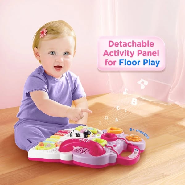 ✅ The easy-to-remove activity panel features five light-up piano keys, three colorful shape sorters, removable cell phone, spinning gears and more