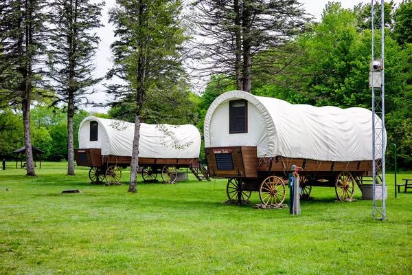 Book a cozy glamp-cation with your crew, sip your morning coffee on a private porch, and check “glamp in a covered wagon” off your bucket list.