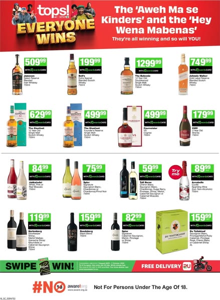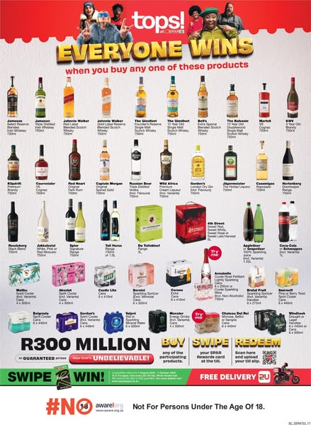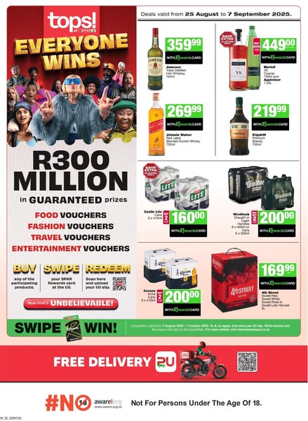搜索关键词 TOPS at SPAR, Rewards Program, Alcohol Deals, Guaranteed Prizes, Drink Responsibly, SPAR promotions, Liquor Store Specials, South Africa Alcohol, wine and whisky, 2025 alcohol offer优势 Guaranteed prizes,Wide selection of alcoholic beverages,Rewards program benefits