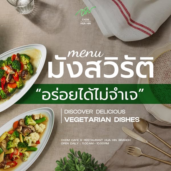 搜索关键词 vegetarian restaurant, Hua Hin restaurant, healthy food Hua Hin, Chom Cafe Hua Hin, Thai vegetarian food, Michelin Plate Hua Hin, vegan options, best restaurants Hua Hin, natural cafe Hua Hin, vegetarian menu优势 Delicious and varied vegetarian options,Nutritious and healthy meals,Award-winning restaurant (Michelin Plate),Pleasant natural ambiance