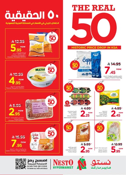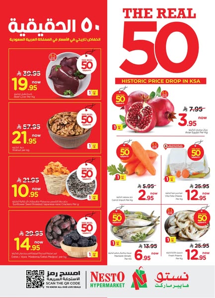 搜索关键词 Nesto Hypermarket Offers, Best Hypermarkets, Shopping in Dammam, Grocery Deals Saudi Arabia, Hypermarket Promotion, Food and Home Needs, Limited Time Offer, Saudi Retail Deals, Fresh Food Offers, Nesto REAL 50优势 Significant savings (REAL 50),Wide range of products,Multiple locations