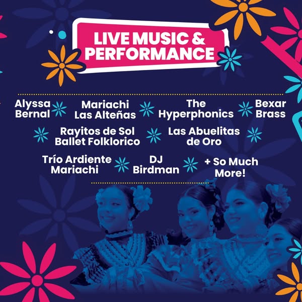 Enjoy incredible acts on our Main Stage, featuring Mariachi Las Alteñas, Trio Ardiente Mariachi, The Hyerphonics, Alyssa Bernal, Bexar Brass, plus stunning Folklórico performances!