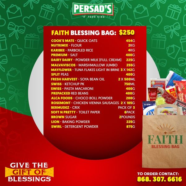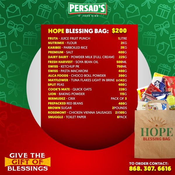 搜索关键词 holiday blessing bags, food king charity, persads food donation, Trinidad food support, seasonal giving program, give back holidays, community holiday care, blessing vouchers families, food assistance program, local charity support优势 Provides essential items to families in need.,Spreads joy and hope during the holiday season.,Easy to order and contribute.