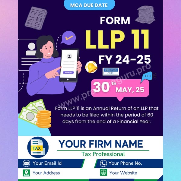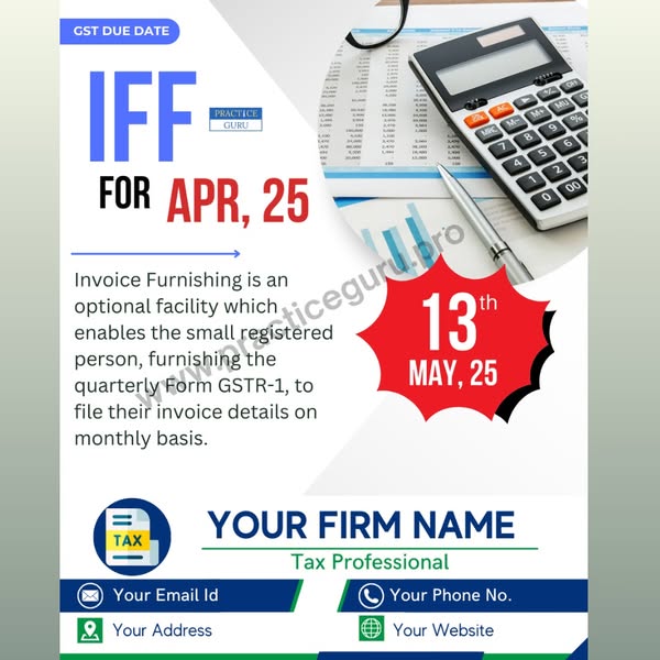 Boost your tax practice with ready-made, branded posters for Due Dates and Festivals — trusted by 3,000+ tax professionals! ✅ No need to design or draft — save time and effort ✅ Affordable and easy to share ✅ Keeps you visible and helps you attract more clients ✅ Keeps your clients informed and engaged Start making a lasting impression today! 📲 Contact us now!