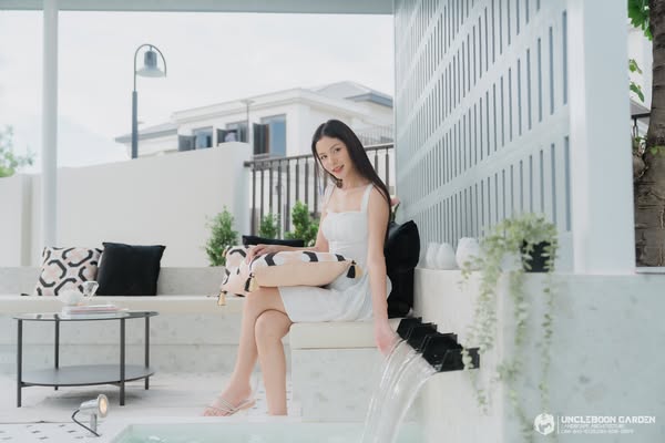สระว่ายน้ำหินอ่อนถูกออกแบบเป็น จุดศูนย์กลางของสวน โครงสร้างใช้วัสดุหินอ่อนคุณภาพสูง เพิ่มความหรูหราและกลมกลืนกับธรรมชาติ พื้นผิวหินอ่อนสะท้อนแสงแดด สร้าง visual warmth และบรรยากาศที่ผ่อนคลาย น้ำสีฟ้าใสในสระสื่อถึง tranquility และความสงบ