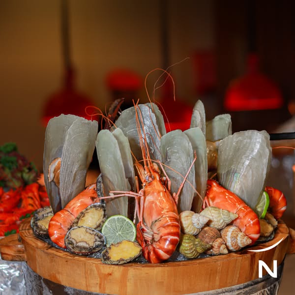As the weekend arrives and life begins to slow down, seafood lovers naturally find their way back to the ocean’s essence at the Seafood Buffet Dinner at Food Exchange. From Friday to Sunday evenings, the warm, inviting space comes alive with the vibrant red of Nha Trang lobster, the sweet, firm texture of Ca Mau crab, fresh trays of abalone, crayfish, oysters, and a wide selection of clams, mussels, and scallops. All freshly prepared right at the live cooking stations, filling the air with irresistible aromas.