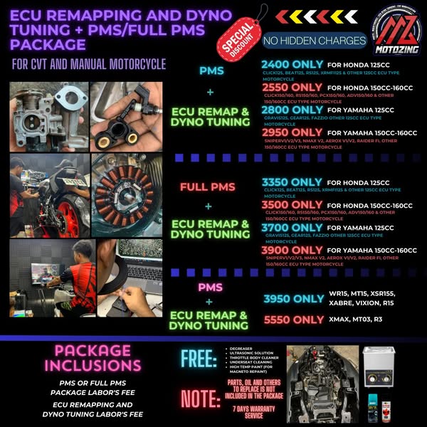 搜索关键词 motorcycle maintenance, motorcycle service, ECU remapping, dyno tuning, motorcycle repair, PMS package, Cavite motorcycle shop, motorcycle accessories, motorcycle performance, motorcycle parts优势 Affordable Packages,Free Cleaning Services,Comprehensive Service List,ECU Remapping and Dyno Tuning,Experienced Mechanics