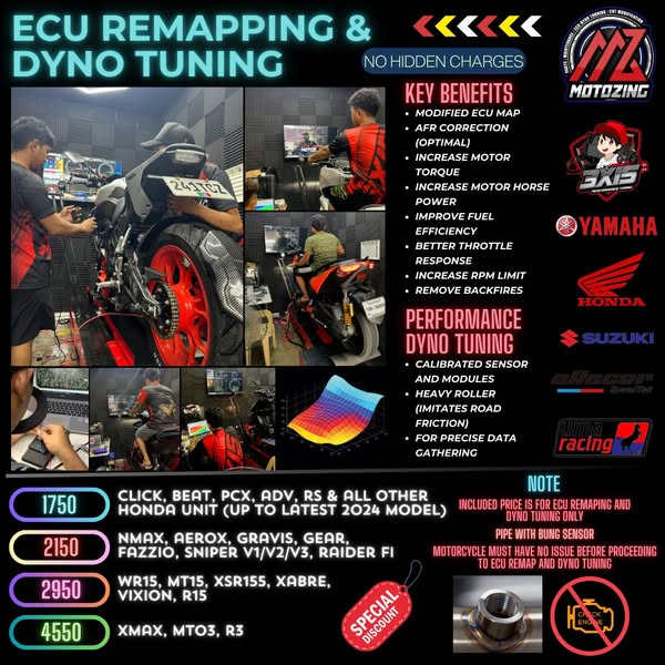 ‼️ ECU Remapping & Performance Dyno Tuning andito na! Same ang result mapa dyno bed man or in actual road. Bitin kaba sa takbo mo? Gusto mo ng mas maarangkada at may dagdag sa perfomance kahit stock? Nagpalit ng pipe at kailangan ng AFR Correction? REMAP na natin yan! On the spot remapping and tuning with your base map, current sensor data and afr correction (hindi copy paste). Stock ecu, racing ecu, kargado, retune, refile available dito.