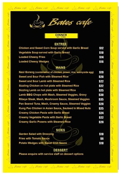 搜索关键词 cafe menu options, personalized functions, corporate lunch, quality meats, fresh ingredients, 2025 promotion, Bates Cafe, tantalizing flavours, event catering, create memories优势 Fresh ingredients,Quality meats,Personalized functions,Corporate events catered