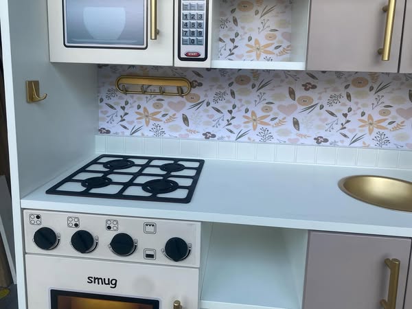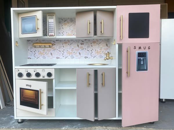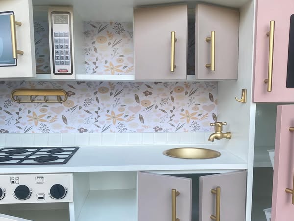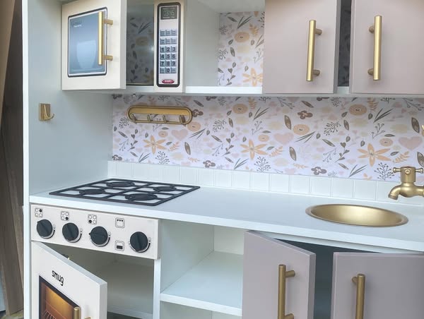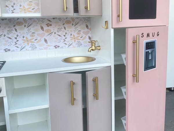 Our latest mini kitchen is serving soft tones and serious storage goals. From the floral splashback to the built-in fridge with pretend water dispenser, every detail is designed to delight.