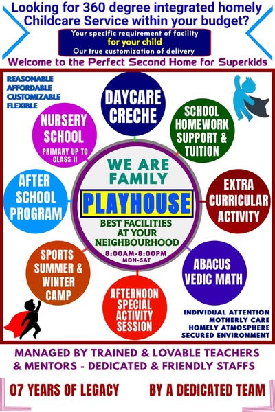 搜索关键词 Kolkata daycare, Best childcare Kolkata, Homely daycare facilities, 12 hour daycare, Daycare google review, Playhouse services, Childcare services Kolkata, Modern amenities daycare, Safe daycare Kolkata, Affordable daycare优势 Homely environment,Modern amenities,12-hour care