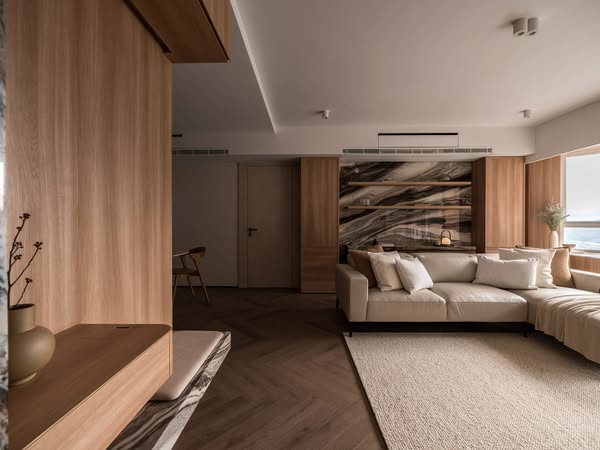 項目位於淺水灣,設三房二廳,團隊在數年前曾為夫婦二人客製化一套現代美學的住宅,但隨著家庭新成員的到來,考慮到孩童未來的成長需求與家庭生活模式的轉變,他們決意另置新居,並改造成溫馨永續的居家環境。在整體空間沒有太多變動的前提下,物料與材質的配搭成為了項目的設計核心,空間以米色、白色為基調,牆壁與儲物空間覆蓋上橡木飾面,配以深色的人字拼胡桃木地板,細緻的木工工藝貫穿整個空間,項目亦同時考慮到户主夫婦對大理石天然紋理的熱愛,在玄關、窗台及客飯廳中加入石材作為點綴,包括沙發後的雲石背板及雕塑般的幾何雲石餐桌。團隊同時將現代美學與溫暖家居融為一體,深淺色木材、黃銅、織物和藤器的相互作用賦予空間獨特的原始魅力,配上天然而多變的紋理觸感,營造出視覺上層次分明的誘人環境。從每個房間都可以看到周圍風景如畫的壯麗景色,增強了起居空間的美感。