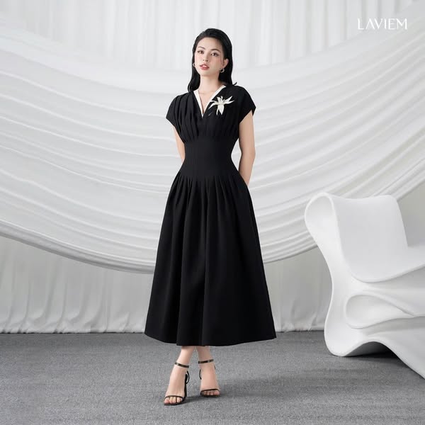 搜索关键词 black linen dress, elegant dress, office evening dress, Vietnamese fashion, Laviem dress, tailored silhouette, versatile dress, women's fashion, stylish dress, classic black dress优势 Sharp and tailored silhouette,Timeless black hue,Versatile for office and evening,High-quality linen