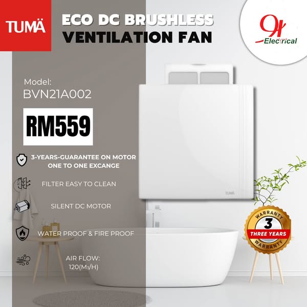 搜索关键词 DC motor ventilation fan, Silent ventilation fan, TUMA eco fan, 91 electrical miri, Best ventilation fan, Waterproof fireproof fan, Home ventilation solutions, Modern design fan, Ventilation fan warranty, Ventilation fan promotion优势 Sleek Design,Silent DC Motor,Waterproof & Fireproof,3-Year Warranty (One-to-one motor exchange),High Airflow with Low Noise