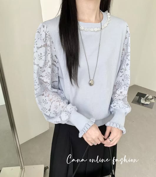搜索关键词 korean fashion top, pearl collar top, floral lace sleeve, summer sale, online fashion shop, elegant women's clothing, made in korea, limited time offer, canaonlinefashion, canacc_accessories优势 Elegant design with pearl collar and floral lace sleeves.,Made in Korea, implying quality.,Multiple color options (blue, pink, white, black).,Accepts various payment methods (FPS, bank transfer, Alipay, WeChat Pay).,Limited-time offer during summer vacation.
