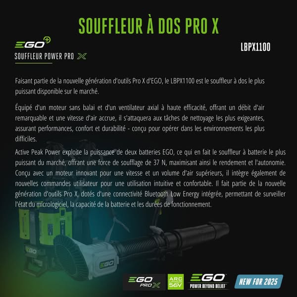 Il fait partie de la nouvelle génération des outils Pro X d'EGO. Ce nouveau LBPX1100 est le souffleur dorsal le plus puissant du marché.