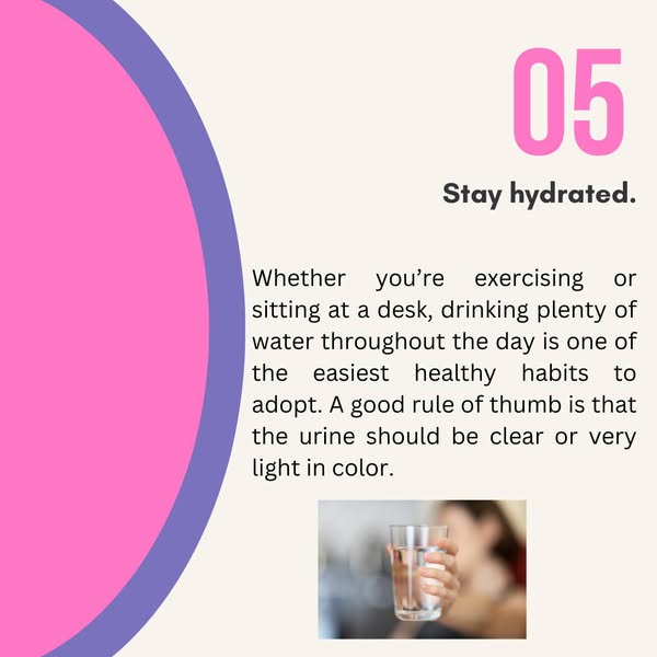 Whether you’re exercising or sitting at a desk, drinking plenty of water throughout the day is one of the easiest healthy habits to adopt. A good rule of thumb is that the urine should be clear or very light in color.