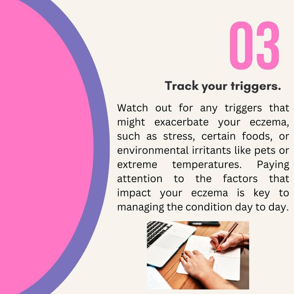 Watch out for any triggers that might exacerbate your eczema, such as stress, certain foods, or environmental irritants like pets or extreme temperatures. Paying attention to the factors that impact your eczema is key to managing the condition day to day.