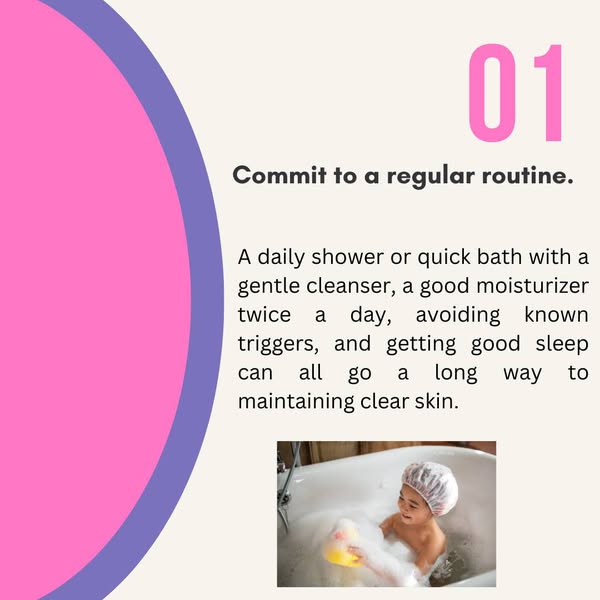 A daily shower or bath with a gentle cleanser, a good moisturizer twice a day, avoiding known triggers, and getting good sleep can all go a long way to maintaining clear skin.