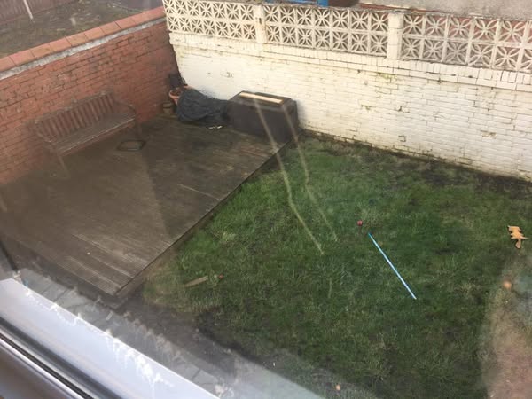 This week we have been busy replacing this tired decking and and flooded lawn area with a Kandla Grey Indian Sandstone patio.