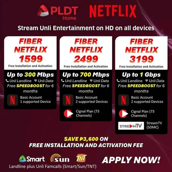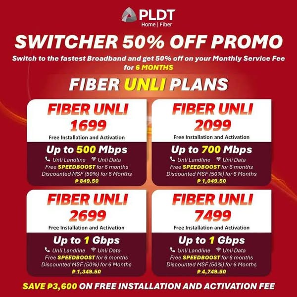 搜索关键词 PLDT Home Fibr, unlimited internet, fiber internet plans, Philippines internet, internet promo, fast reliable internet, internet and landline, Netflix bundle, Cignal bundle, online application优势 Unlimited fast internet connection,Free installation,Free activation,Bundled with Netflix, Cignal, and Landline options,Switcher promo: 50% off for 6 months