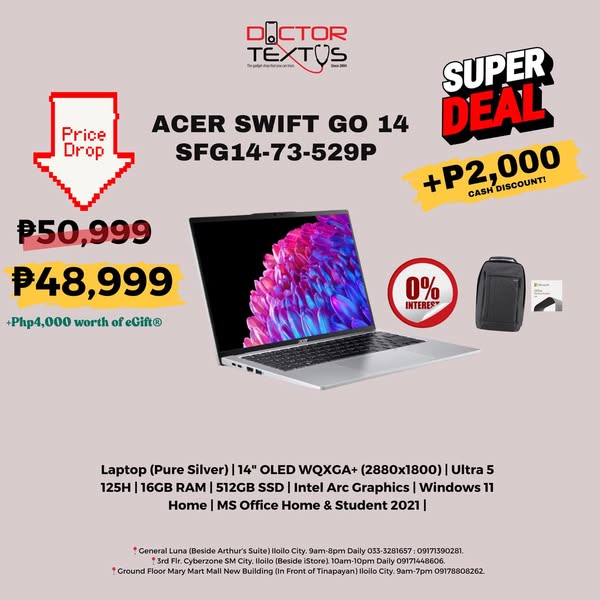 搜索关键词 Acer laptops, back to school, laptop deals, Iloilo City, installment plans, discount laptops, trade in laptops, Doctor Textus, Acer Nitro, affordable laptops优势 In-store discounts,0% installment plans,Trade-in options,Multiple payment options (credit cards, etc.)