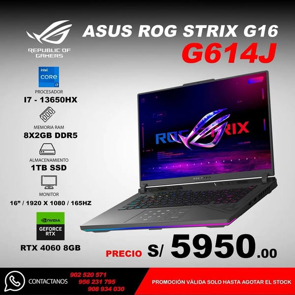 搜索关键词 gaming laptops, rog laptop, msi laptop, tuf gaming, lenovo legion, ryzen processor, intel processor, 165hz screen, peru computer shop, gamer pc优势 Top Brands (ROG, MSI, TUF, Lenovo Legion),Latest Generation Ryzen or Intel Processors,High Refresh Rate Screens (up to 165Hz),Special prices for a limited time,Nationwide shipping