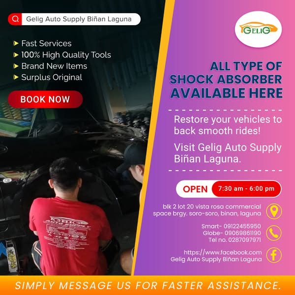 搜索关键词 auto repair, underchassis, car parts, Philippines, shock absorber, suspension repair, Gelig Auto Supply, auto service, car maintenance, Tagalog auto repair优势 Expert underchassis specialist,Fixes various underchassis problems (kalampag, tagtag, etc.),Wide range of underchassis parts available,Multiple branches across the Philippines,Warranty offered on shock absorbers,Accepts various payment methods (Cash, GCash, Online Payment)