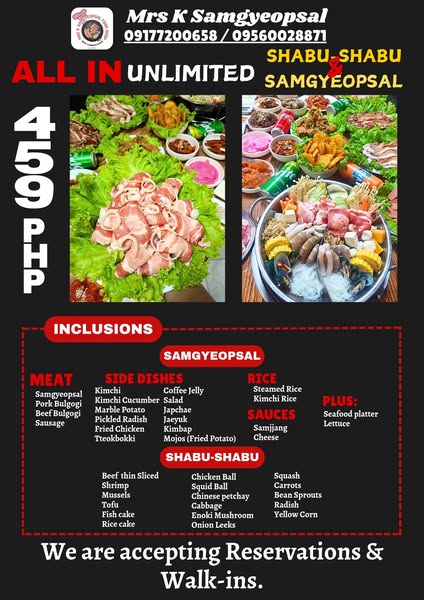 搜索关键词 unlimited samgyeopsal, shabu shabu, korean restaurant, Laoag restaurant, philippine cuisine, meat feast, summer promotion, affordable dining, korean bbq, restaurant promotion优势 Unlimited food,Wide variety of meats and side dishes,Affordable price (339 PHP / 459 PHP)