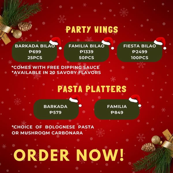 搜索关键词 Holiday platters, unlimited wings, Valenzuela food, Bulacan restaurant, Christmas party food, Delivery service, food cravings, unlimited 199, sulit meals, chicken wings优势 Convenient holiday meal options,Suitable for various occasions,Available for pick-up and delivery,Unlimited option available.
