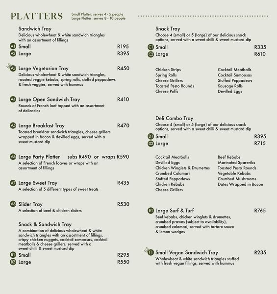 搜索关键词 sandwich shop, platter orders, holiday platters, christmas platters, new year platters, food delivery, catering service, south africa, online menu, WhatsApp order优势 Convenient platter orders for holidays,Easy to order via phone or WhatsApp,Online menu available
