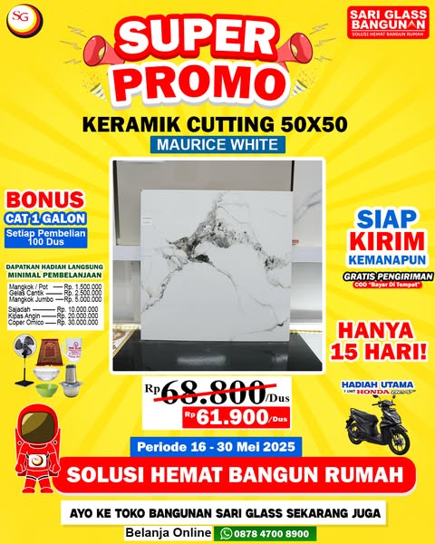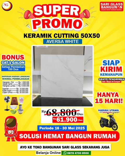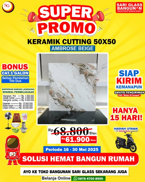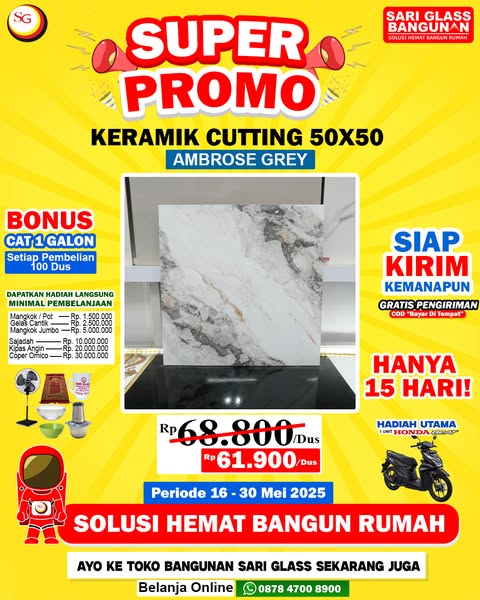 搜索关键词 Keramik UNO, Tile Promotion, Building Materials, Sari Glass, Free Delivery, COD Payment, Discount Tiles, House Building, Renovation Tiles, Cheap Tiles优势 Granite-like nat angle (elegant and neat appearance),Discounted price during promotion period,Free 1 gallon of paint for minimum purchase of 100 boxes,COD payment option,Free delivery,Free consultation