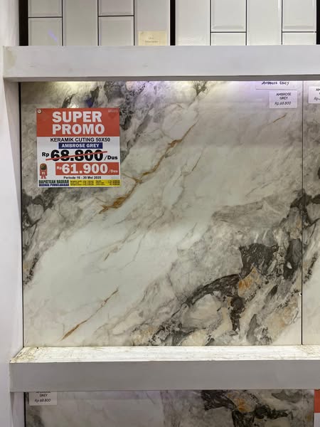 SUPER PROMO KERAMIK UNO 50x50 CUTTING ( sudut nat seperti granite ) keramik yang memiliki sudut nat seperti granite memiliki kesan elegant dan rapih untuk rumah ANDA , tanggal 16-30 MEI 2025 keramik ini sedang PROMO dari harga 68.800/dus menjadi 61.900/dus dengan STOK yang cukup TERBATAS, dan 1 galon cat BONUS untuk ANDA yang bertransaksi minimal 100 dus